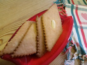 Kjevle tynt ut, deigen skal kjevles så tynt at benkeplaten synes gjennom deigen. Skjær ut snipper og legg en halv skåldet mandel på hver. Stek ved 180 grader ca 5 minutter.