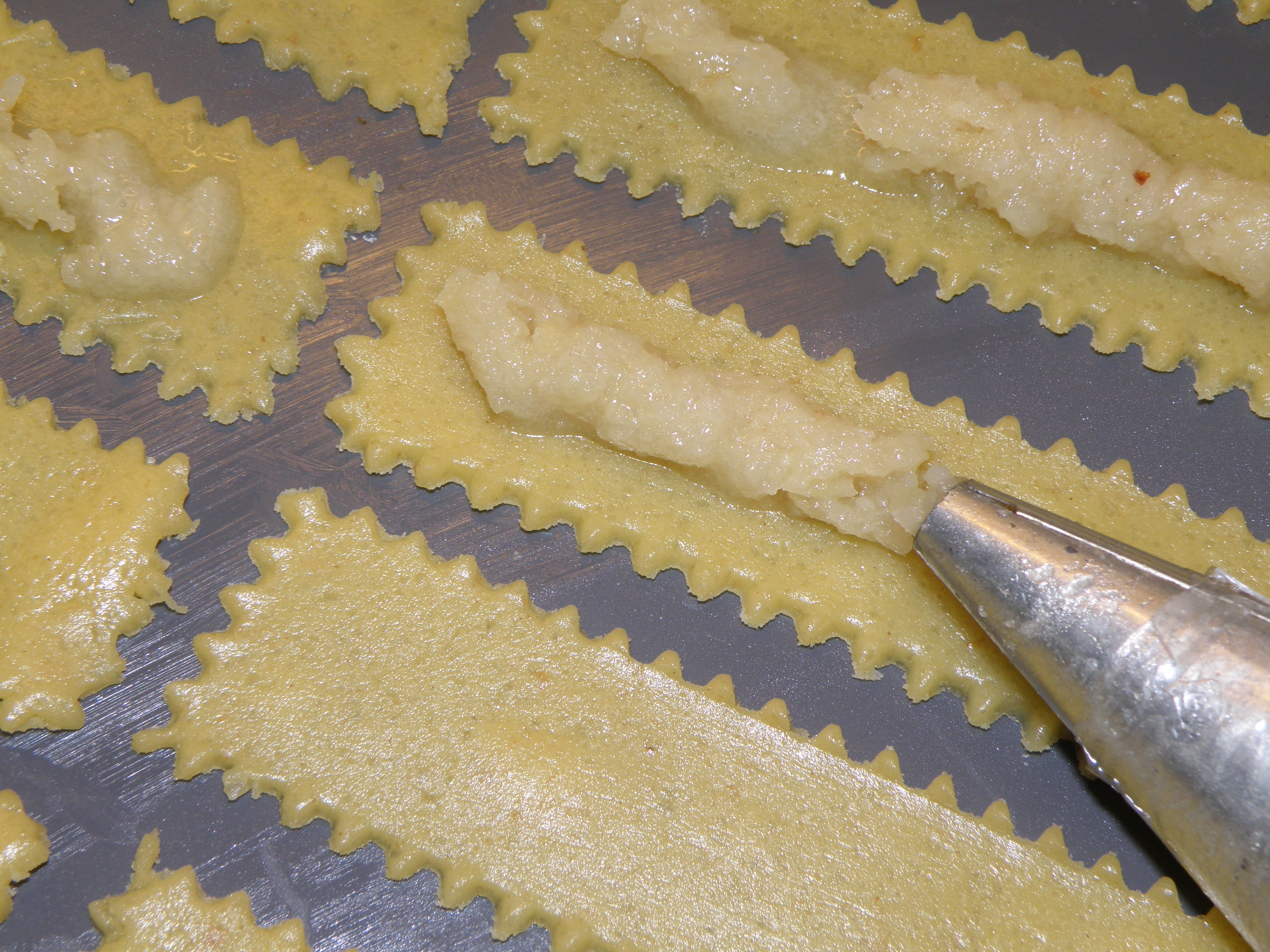 Kjevle deigen tynt ut og skjær ut lengder, ca 3×12 cm. Legges på plate. Legg mandelmassen på midten av kakene, eventuelt kan du sprøyte den ut.