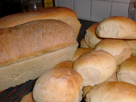 Av og til kan det være godt med hjemmelaget loff. Siden jeg ikke tåler hvete, blir den da bakt med spelt. Bakst med spelt er mer næringsrik enn bakst av fin hvete. Grunnen til det, er at mens næringsstoffene i hvete sitter i skallet, er næringsstoffene spredd i hele kornet på spelt. Når man da fjerner skallet på hveten for å lage hvitt mel, fjernes en hel del av næringsstoffene. Det som er litt viktig å huske når man baker med spelt, er at det ikke trekker fuktighet like godt som hvete. Dermed må man enten øke melmengden eller minke væskemengden i sine vanlige oppskrifter. Og for å få best mulig resultat, bør det tilsettes eple- eller appelsinjuice. C-vitamin bedrer bakeegenskapene i gjærdeiger, og er tilsatt i hvetemel i form av askorbinsyre. Har du ikke juice, kan du knuse en C-vitaminpille og tilsette i stedet. Jeg har også brukt nypesyltetøy og solbærgelé i mangel på andre C-vitaminholdige ingredienser. Oppskriften her er hentet fra boken Bak med spelt av Mone Eli Sæland. Jeg har økt oppskriften endel, og fikk 2 brød i 1,5l former og 35 rundstykker. Deles denne oppskriften i to, vil du kunne få to brød i 2-liters former.