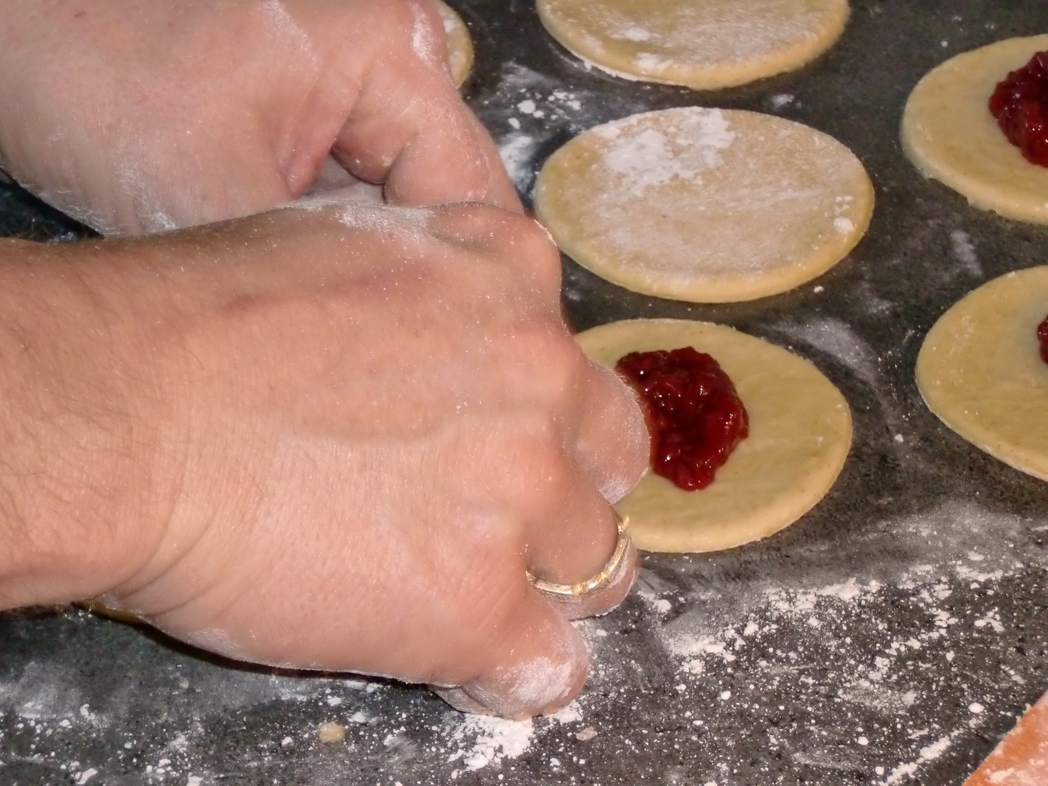 Elt inn resten av melet på bakebordet. Kjevle ut til ca 1/2 cm tykkelse og stikk ut runde emner, 7-8 cm i diameter. Legg på litt syltetøy eller vaniljekrem på midten på halvparten av emnene. Pensle med eggehvite rundt kanten og legg resten av emnene over. Klem kantene godt til. Etterhev i ca 10 minutter.