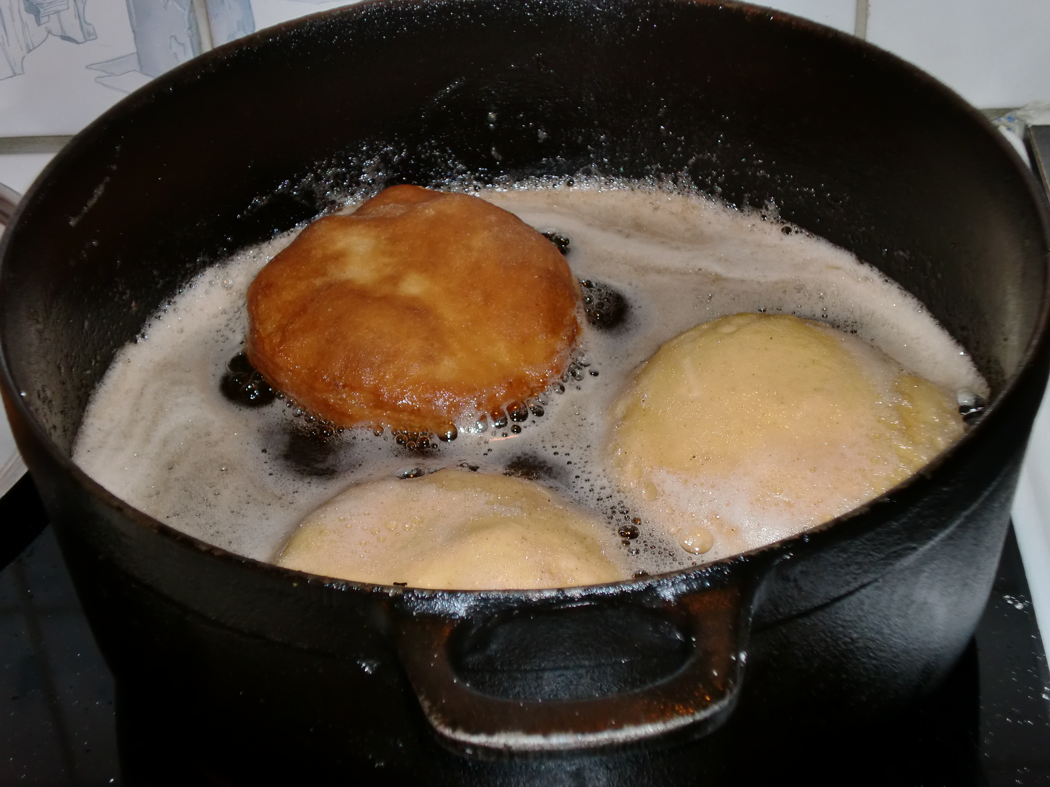 Varm fettet til ca 180 grader. Prøv med en brødbit, den skal bli gyllen på 1 minutt. Friter noen boller om gangen, 5-6 minutter. Snu dem underveis. La dem renne godt av seg på kjøkkenpapir. Husk å alltid ha grytelokket i nærheten når du friterer i tilfelle fettet skulle bli for varmt og ta fyr.