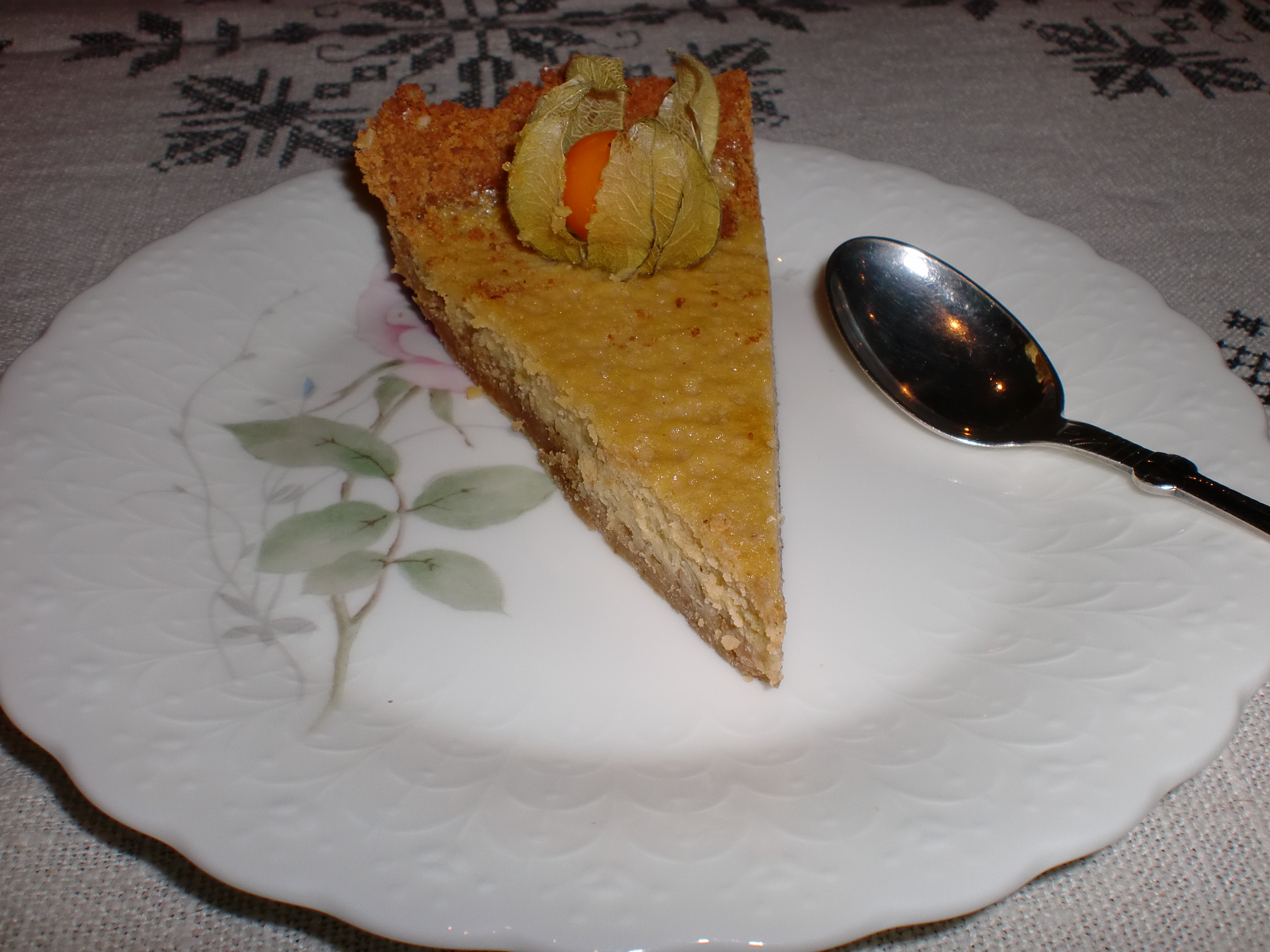 Stek kaken ved 175 grader i 20-30 minutter. Følg med når ostemassen er stivnet. Avkjøl og settes i kjøleskap til den serveres. Pynt gjerne med physalis eller jordbær.