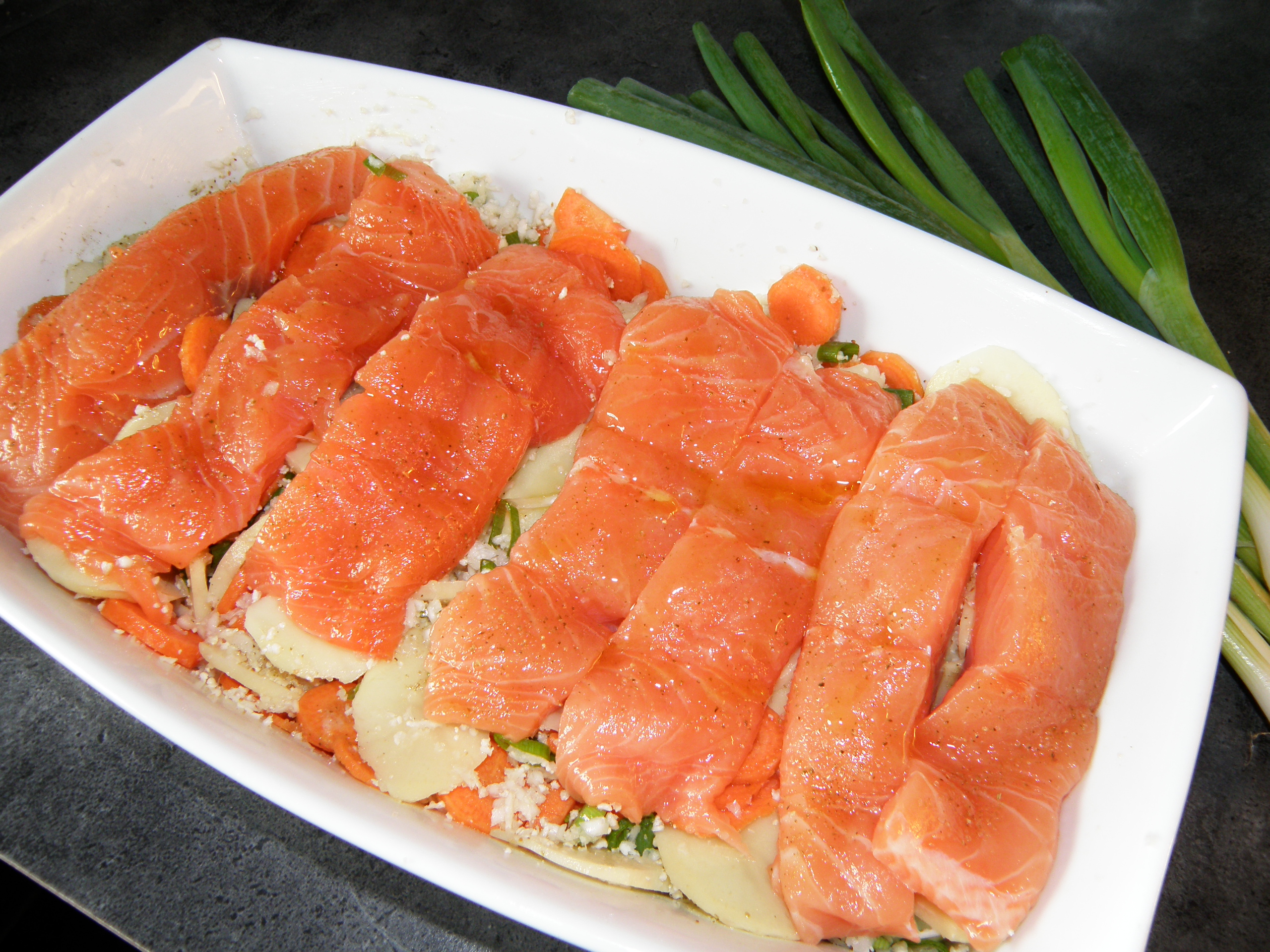 Av og til er det greit med mat man kan lage alt i ett. Mat som passer seg selv mens man gjør andre ting. Derfor ble det en form med grønnsaker og fisk i komfyren i dag. Enkelt og greit.