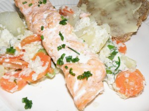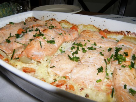Legg på lokk eller dekk formen med aluminiumsfolie. Stekes på 175 – 200 grader i en god time. Hos meg kolliderte middagen med brødbaksten, så jeg stekte alt på en gang på varmluft, og serverte middagen med nystekt brød til. Dryss eventuelt over klippet gressløk til pynt