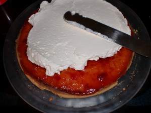 Fyll kaken med syltetøy eller bær og pisket krem. Jeg pleier som regel å bruke hjemmelaget solbærgelé inni hvis ikke mottaker har ytret ønske om noe annet.