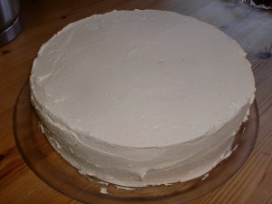 Så dekkes hele kaken med et lag krem. Til en kake på 26 cm i diameter, bruker jeg en god liter kremfløte inni og til å dekke den med. Skal du lage kremkake/bløtkake, trengs det mer fløte.