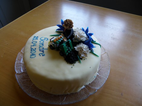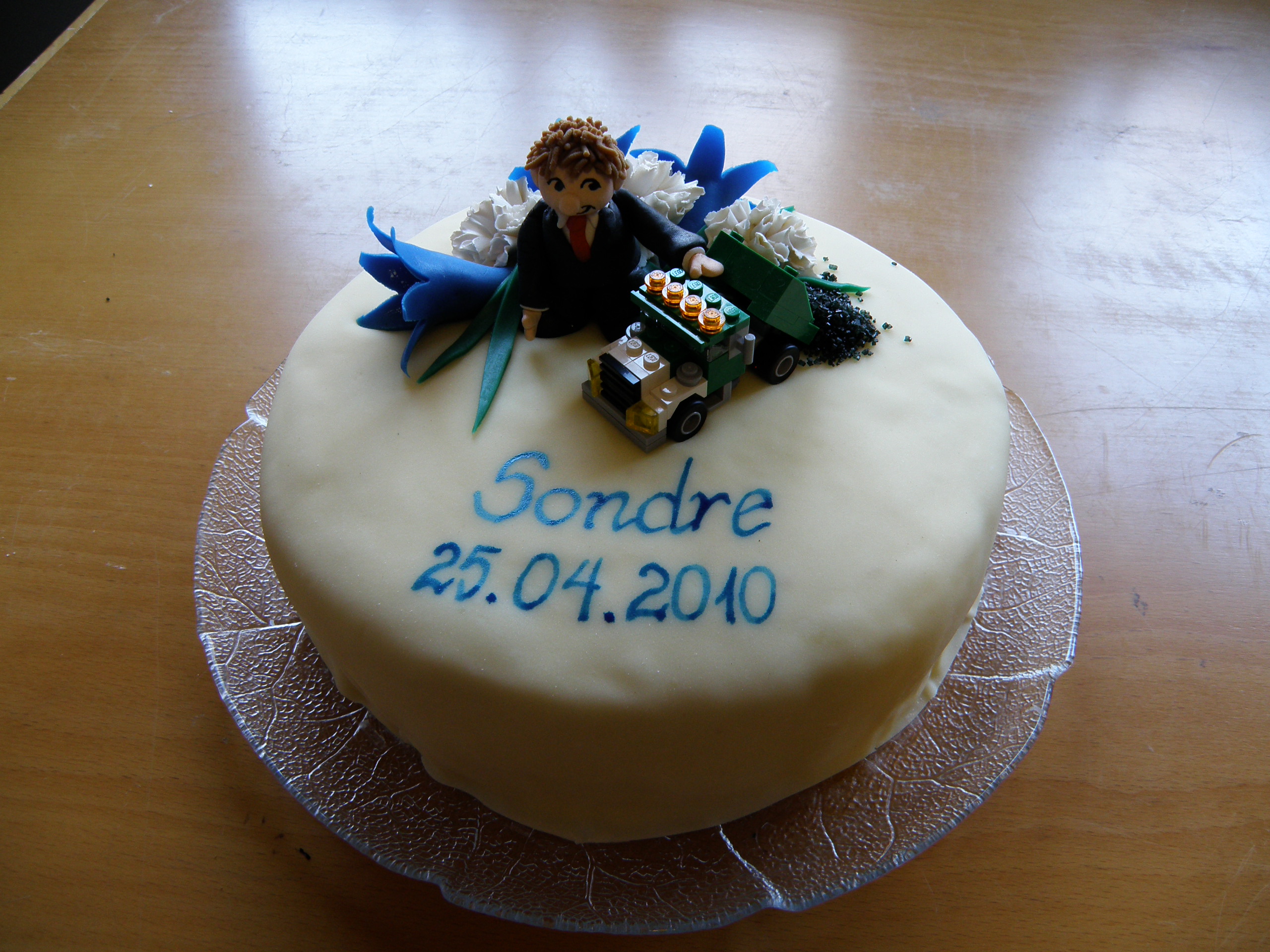 Konfirmanten har vært en legobygger siden han var liten. Alt av lego han har kjøpt og fått opp gjennom årene har stort sett vært anleggskjøretøy. Star Wars og Harry Potter lego har ikke interessert ham. Jo større kjøretøy, dess bedre, og gjerne motoriserte i tillegg. Derfor den orginale vrien på kakepynten, lego og lastebil… Grusen i lasteplanet er perlesukker som er farget med svart farge fra Wilton.