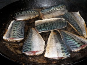 Jeg beregner en til halvannen makrell pr person, alt etter størrelsen på den. Skjær filét av den og krydre med salt og pepper. Evt kan du «mjølve» den, dvs blande mel og krydder og vende fisken i før steking.