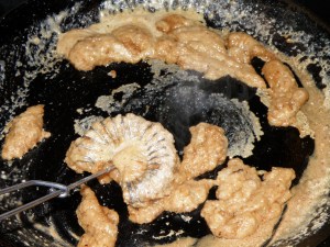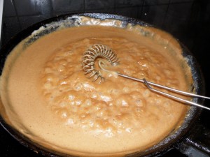 Smelt en god klump smør i stekepannen (2-3 ss). Rør inn et par spiseskjeer mel, og la det gjerne brunes litt.