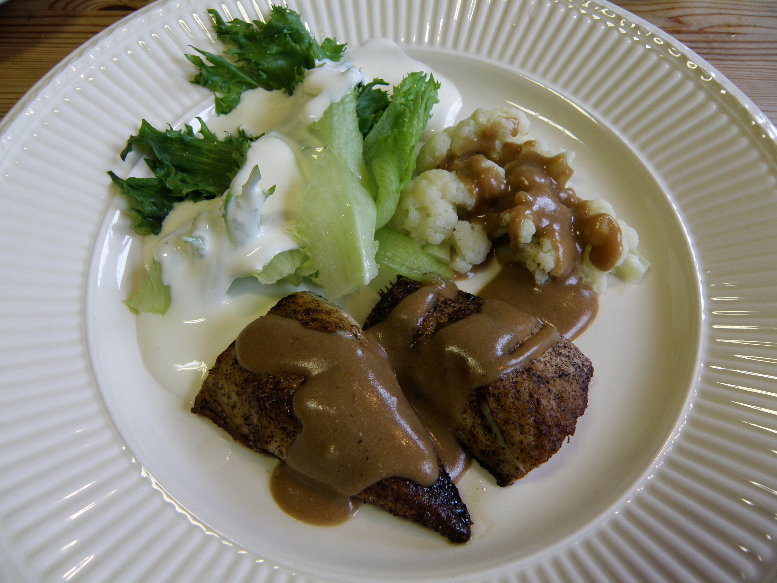 Serveres med potet, revet salat og en dressing av like deler rømme og kulturmelk smakt til med sukker. Den observante leser ser nok at jeg har utelatt poteten på tallerkenen, av den enkle grunn at jeg ikke er så glad i potet. Jeg bruker blomkål istedet.
