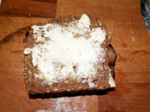 Nå droppet jeg det hvite brødet og tok heller et par skiver skikkelig grovt speltbrød med solsikkekjerner. Disse ble så smurt med et godt lag peanøttsmør. Den ene ble deretter dekket av banan og litt honning. Den andre ble det lagt stekt bacon på. Så ble disse to skivene lagt sammen og smurt med smør på utsidene.