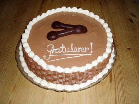 I og med jeg har et rikholdig bildegalleri av kaker å ta av, fant jeg et bilde som passer bra som gratulasjon til vedkommende som inspirerte meg til å starte med matblogging, nemlig Ina med bloggen Kjøkkentjeneste. Kaken er en sjokoladekake med knuste Lohengrin som fyll, Lohengrin som bare gamle damer spiser fikk jeg høre av den pur unge kassadamen da jeg kjøpte inn sjokolade til denne kaken…