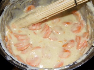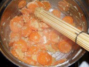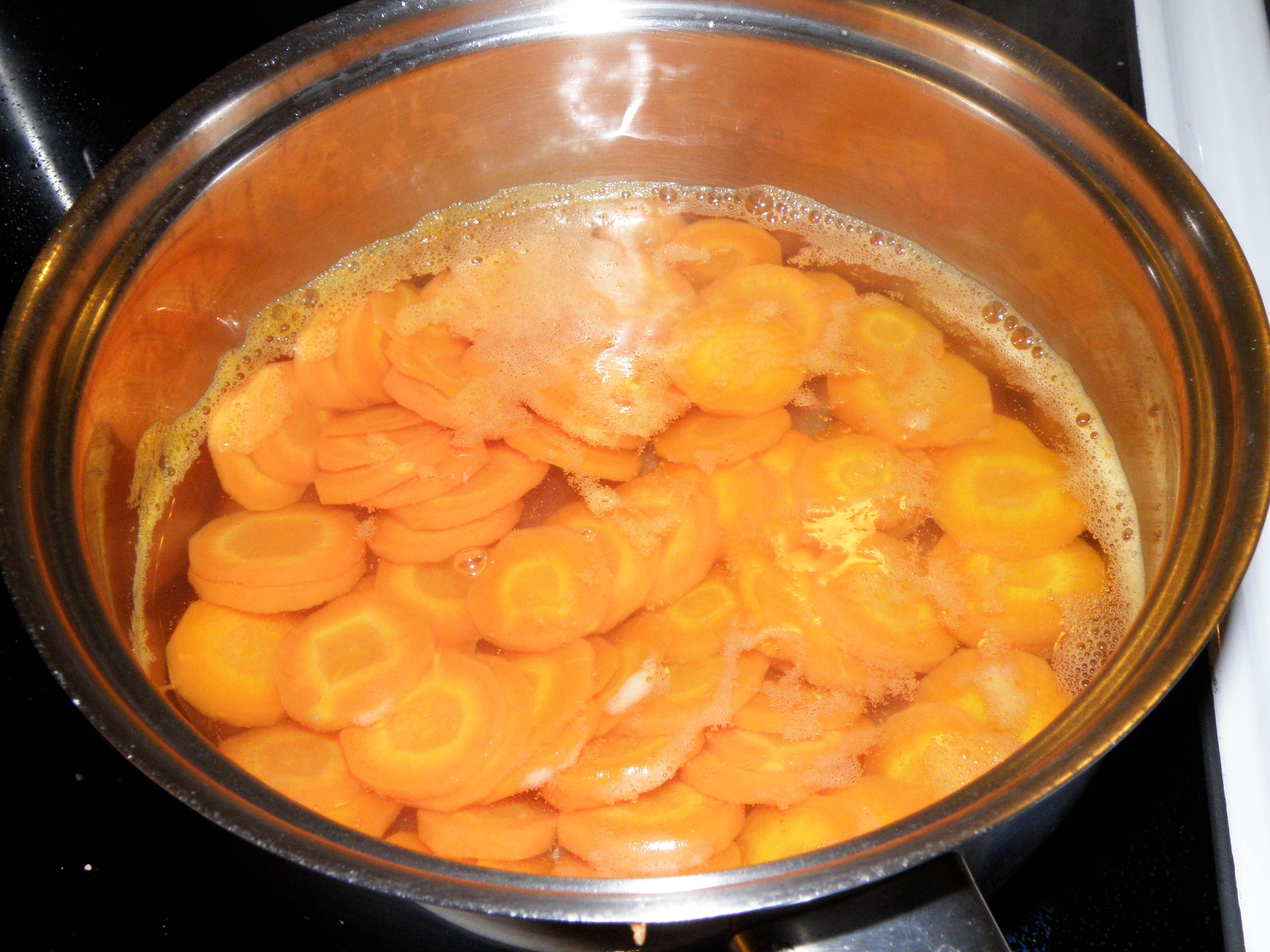 Uansett, skrell og skjær 4-5 gulrøtter i skiver. Kok dem møre i lettsaltet vann.