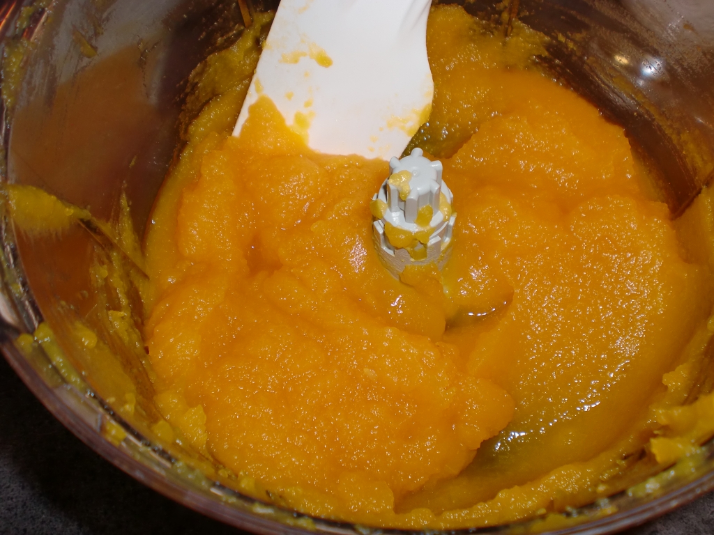 Skjær gresskarinnmaten i biter, dryss over bittelitt salt og kok det mørt i 1/2 – 1 dl vann. Det ser tørt ut, men det safter seg. Hell av vannet og kjør det til mos i foodprossessor. Det skal være ca 5 dl mos i paifyllet. Avkjøl.