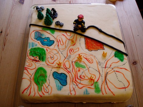 Jeg fortsetter å legge ut bilder av kaker jeg har laget. Denne ble laget i 2007 da en av brannmennene fylte 60 år. I tillegg til jobben er han ivrig syklist og orienteringsløper. Derfor er kaken dekorert som et O-kart og han har sykkelhjelm i stedet for brannhjelm. På kaken er han i ferd med å slukke de små brannene på kartet.