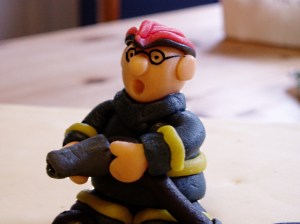 Kaken er vanlig sukkerbrød i langpanne, bare at den er laget med hvetemel istedet for spelt siden jeg ikke skulle ha den selv… Fyllet er solbærgele og pisket krem. Så er den trukket med marsipan, pyntet med figurer i marsipan og malt med uttynnede pastafarger fra Wilton.