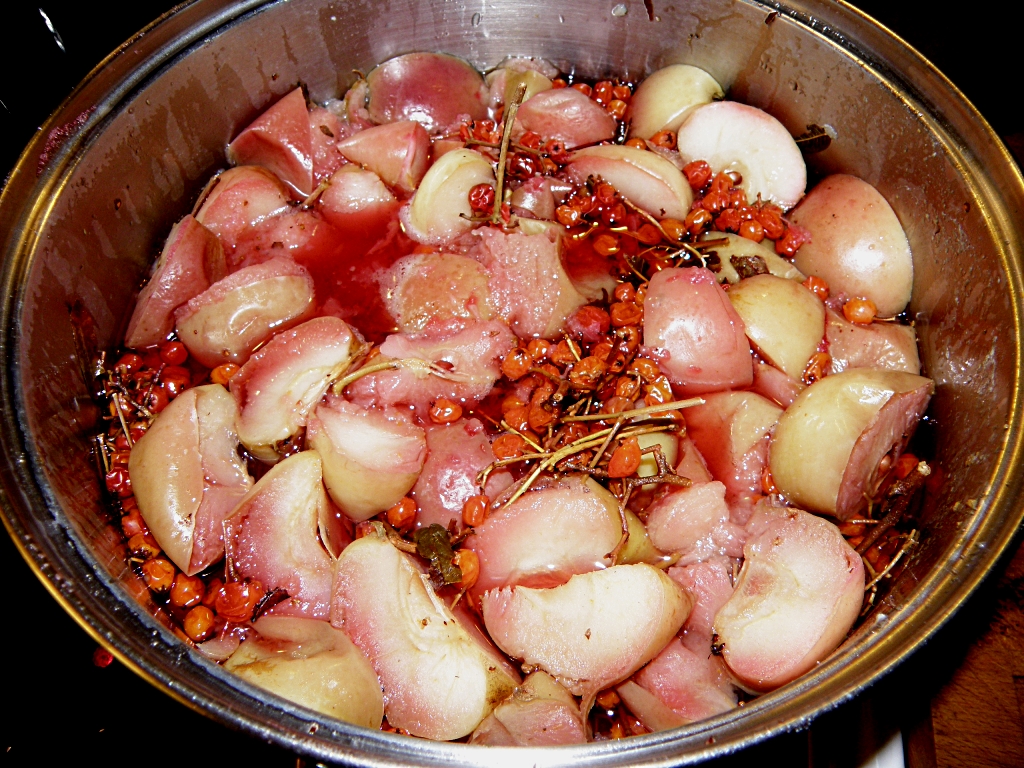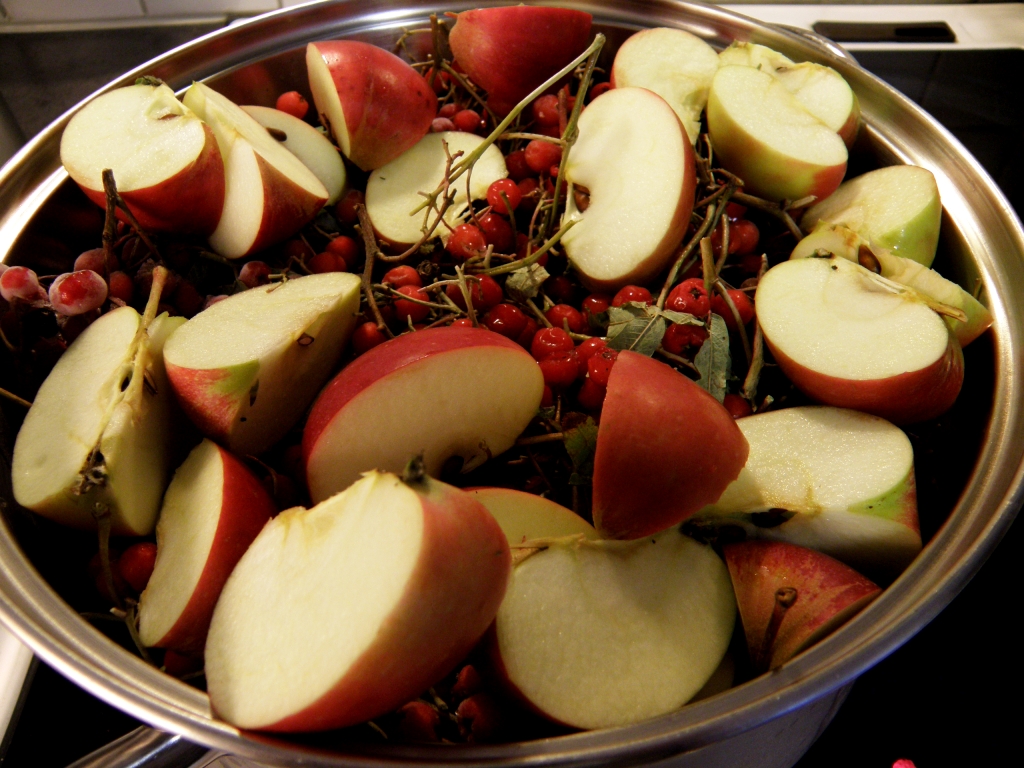 Gele av bare rogn blir veldig bittert, så jeg har kokt dem sammen med epler for å mildne smaken litt. Her er 2 kg rognebær og 1 kg epler.