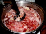 Av denne porsjonen fikk jeg 2,3 liter saft. Saften kokes så opp og får koke et par minutter før sukkeret has oppi. I dette tilfellet hadde jeg i snaue 2 kg sukker. Beregningene går på ca 800 g pr liter saft.
