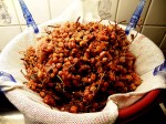 Sett massen til avsiling. Jeg har brukt en linklut over en bøtte, siledukene og stativene som er å få kjøpt syns jeg rommer for lite.