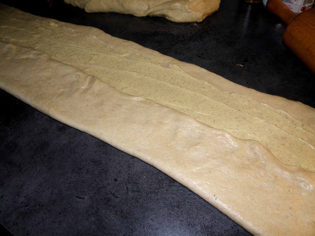 Til en fjerdedel av deigen rører du ca 100 g smør med noen spiseskjeer sukker og en teskje malt vanilje.