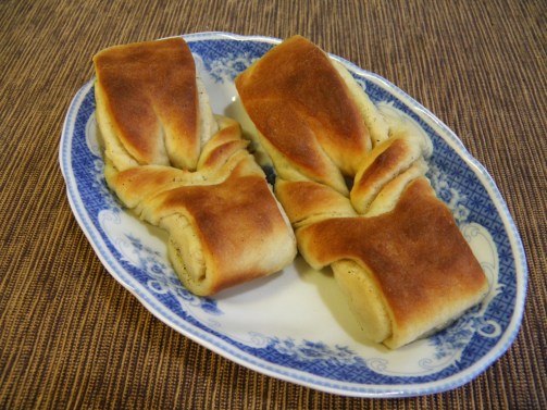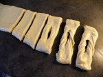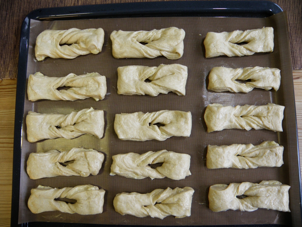 Skjær biter på 4-5 cm. Lag et snitt i hver og vreng den ene halvdelen gjennom hullet. På samme måte som med fattigmannsbakkels.