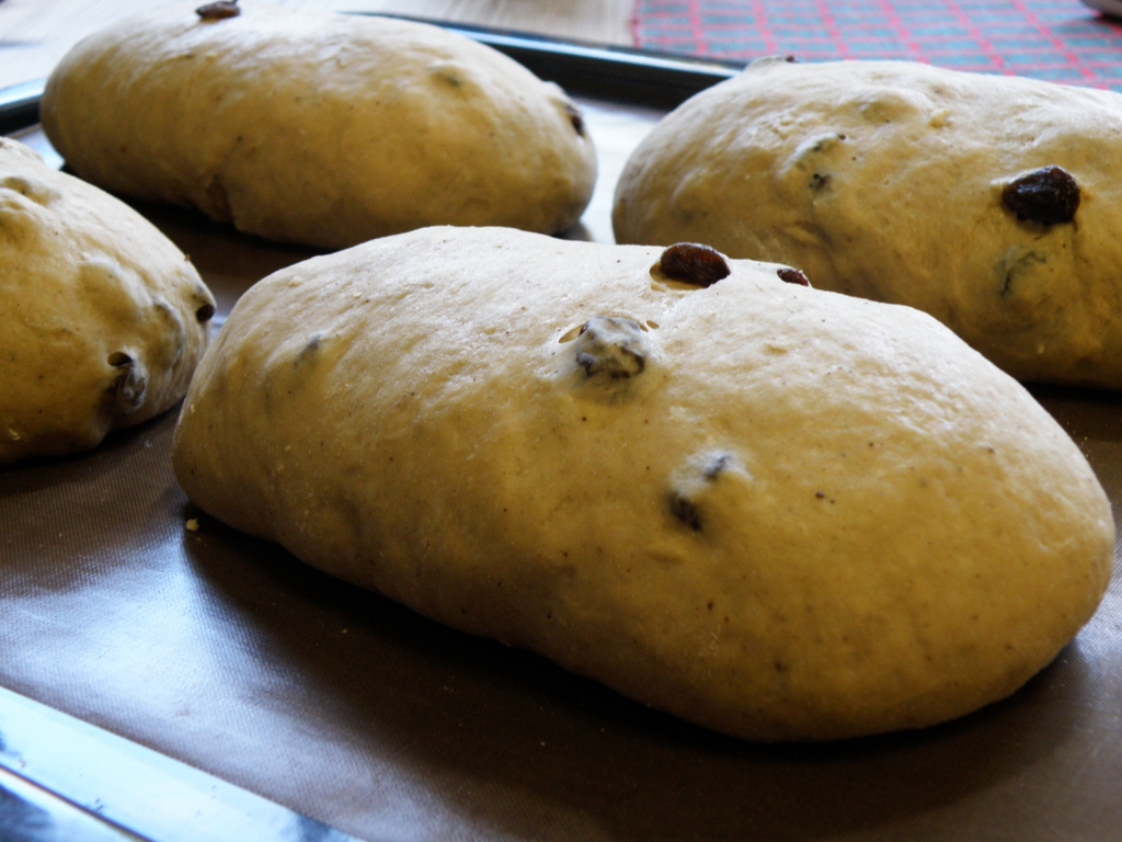Del deigen i to og form to runde eller avlange sprekkfrie emner. Om du har personer med rosinfobi i familien slik som jeg, kan rosinene knas direkte inn i deigen. Da kan du lage småbrød slik at alle får det de liker…
