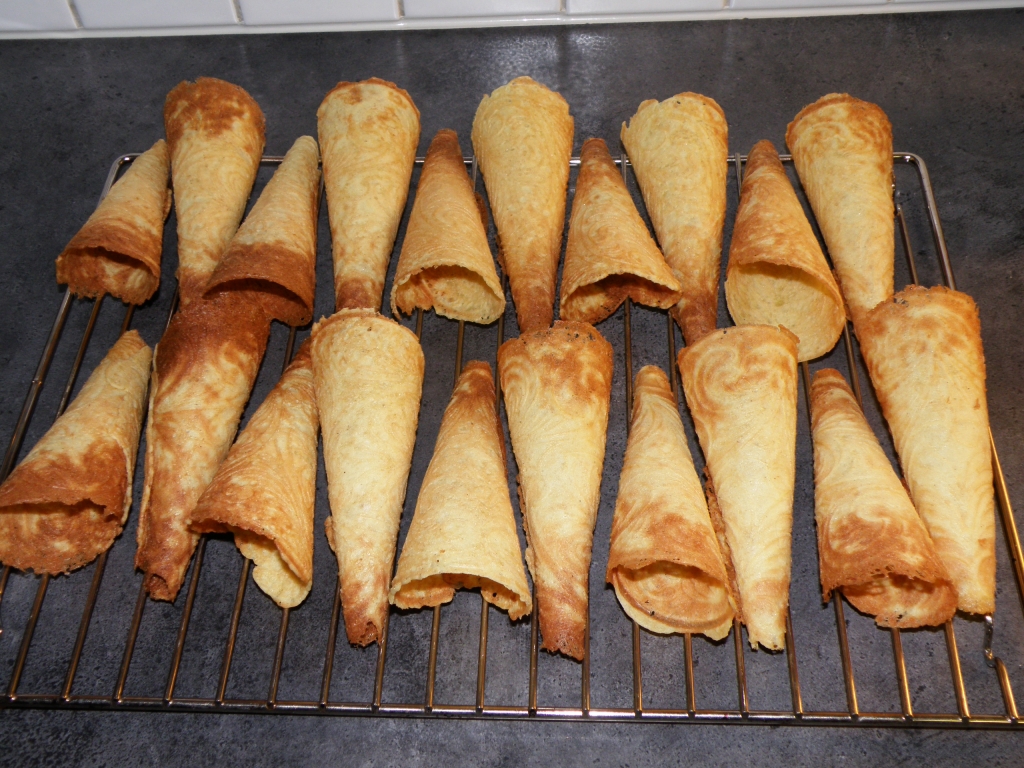 Av en røre basert på 4 egg, fikk jeg nesten 60 krumkaker. Til neste år tror jeg det holder med halvdelen…