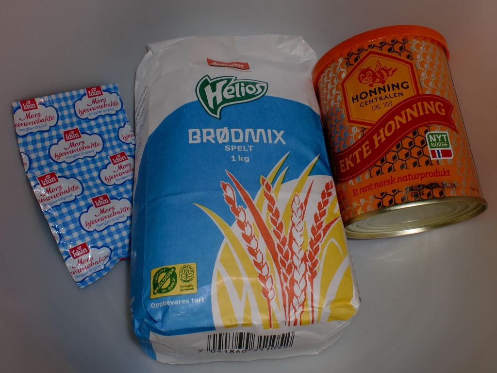 Jeg gjorde det veldig enkelt med baksten. Ferdig speltmix fra Helios gir et grovt og sundt brød, og 1 kg gir to brød. Brødmixen ble blandet med 7 dl vann, 2 ss honning, 1/2 ts tørrgjær og 1 ts salt. Deigen satte jeg om kvelden i 21-tiden og lot den stå til formiddagen etter.