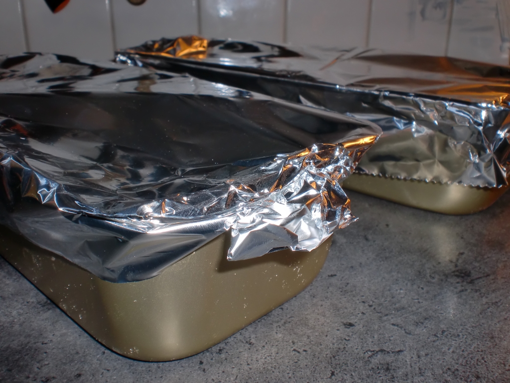 Etter hevingen la jeg aluminiumsfolie over formene før jeg satte dem nederst i komfyren på 250 grader.
