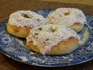 Avkjøl på rist. Like før servering blander du litt tynn melisglasur som du stryker over bollene. Ha kokosmasse i en dyp tallerken og dypp bollene raskt i kokosen. Skal de fryses, gjøres det uten melis og kokos.
