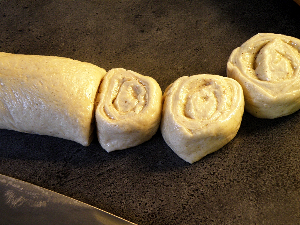 Oppskriften til kanelbollene finner du i mitt tidligere innlegg. Etter heving, has deigen ut på melet bakebord og formes lett til en litt tykk pølse. Ikke kna deigen.