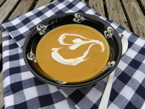 Det fine med Matbloggsentralen er at man finner mange andre matinteresserte med fristende oppskrifter og blogger. En av dem er Brød og elefanter hvor jeg fant oppskrift på sveitsisk gresskarsuppe. Det er ikke sesong for gresskar nå, men har du gjort som jeg, har du gresskar i fryseboksen. De er fin-fine å fryse. I den opprinnelige oppskriften skal suppen garneres med gresskarolje, men den prøvde jeg ikke å finne tak i. Jeg nøyde meg med litt rømme på toppen.