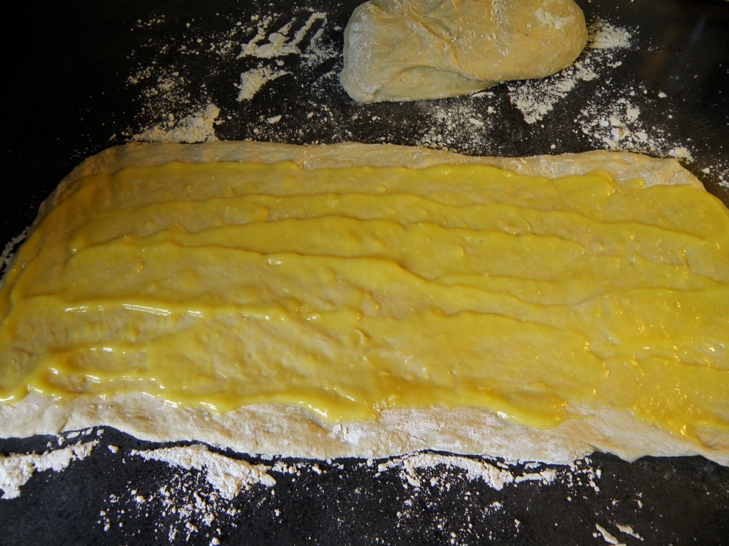 Sitronkrem ble smurt utover leiven, som deretter ble rullet sammen og lagt på stekebrett. Litt omstendelig prosess da deigen var litt lealaus… Men jeg fikk da skyflet den over.