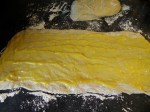 Etter å ha gitt deigen en god forheving, klappet jeg den ut til et rektangel på benken. Den var så medgjørlig og fin at jeg ikke trengte kjevle i det hele tatt. Litt av hemmeligheten med å bake med spelt – den skal ikke knas, bare strekkes.