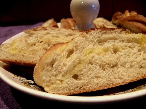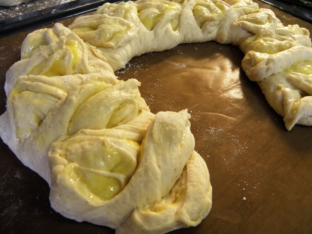 Utgangspunktet er en vanlig søt gjærdeig, som du finner oppskrift på i mitt tidligere innlegg, men jeg halverte mengden og laget to kranser. I tillegg ble den laget med bare vann og med melkefri margarin da min mor er litt ømfintlig overfor melk. Og fyllet besto av sitronkremen jeg skrev om for litt siden.