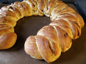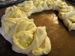 Selve klippingen og formingen av kransen gjøres ved å klippe snitt på skrå i deigpølsen. Så brettes snittene utover til hver side. Jeg klippet alt opp først og fant ut at det var lite lurt. Da klebet deigen seg sammen igjen. Så det smarte er å klippe og brette etterhvert.