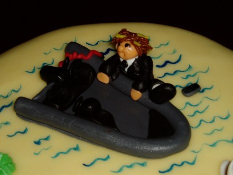 Temaet for kaken var veldig enkel. Han hadde sin egen gummibåt og ramlet som regel alltid ut av båten, enten på vei oppi eller på vei på land. Dermed var også forbruket av mobiltelefoner rimelig høyt. Hvis du ser nærmere etter på bildene, ser du mobilen som ligger i vannet ved siden av ham…