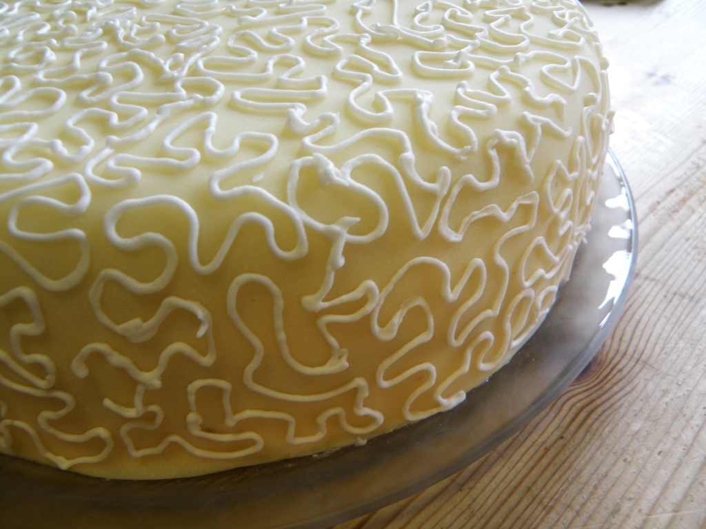 Min svigerfar døde brått og ble begravet fredag 20 april. Jeg skulle lage to marsipankaker til minnestunden og grublet mye over hvordan jeg skulle pynte dem. Det føltes feil å pynte dem som vanlige festkaker… Det ble helt enkel pynt av icing som bare ble sprøytet i snirkler over hele kaken. Ved servering ble det lagt en mørkerød levende rose tvers over hele kaken, men det har jeg dessverre ikke bilde av.