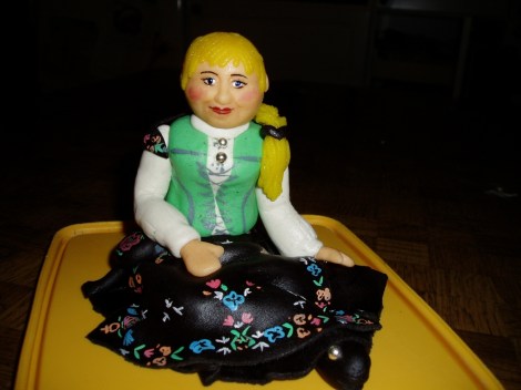 Denne figuren ble laget til min nieses konfirmasjon i 2005. Jeg hadde da brodert Jelsabunad til henne, så hva var vel da mer naturlig enn å lage en kakekonfirmant av marsipan ikledd samme bunad? Alt er laget for hånd, bunaden er malt med Wilton gelefarger som er iblandet litt hvit for å få dem dekkende.