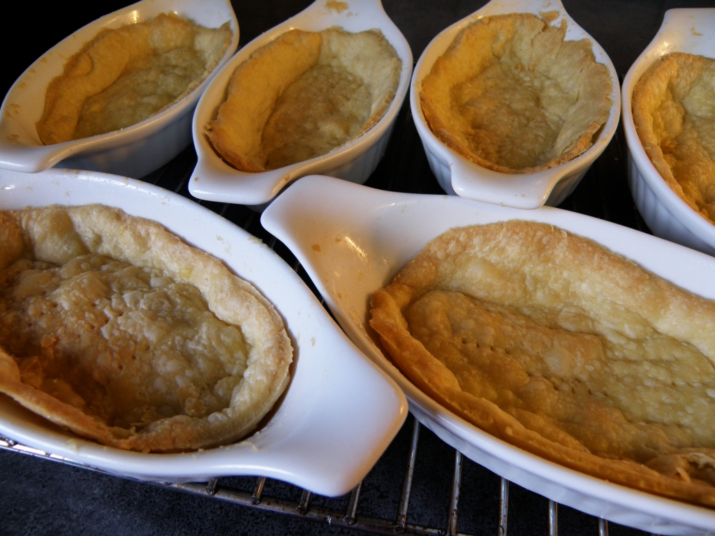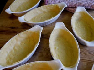 Kjevle ut deigen og dekk små smurte porsjonsformer. Jeg fikk sju stykker av mine båtformede former. Prikk deigen lett og sett dem kaldt en halvtimes tid.