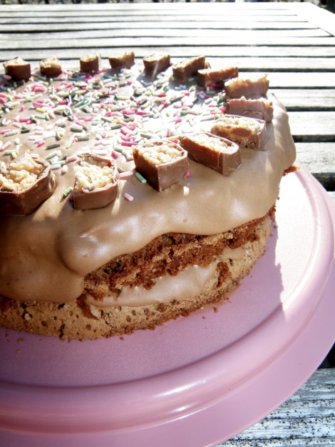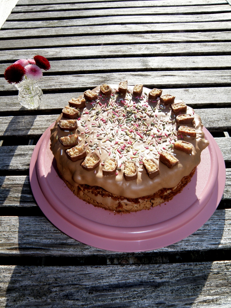 I anledning eldstesønns bursdag, lagde jeg en liten kake som vi tok med på overraskelsesbesøk… Oppskriften finner du her, men jeg har halvert den og stekt den i en form på bare 18 cm i diameter.