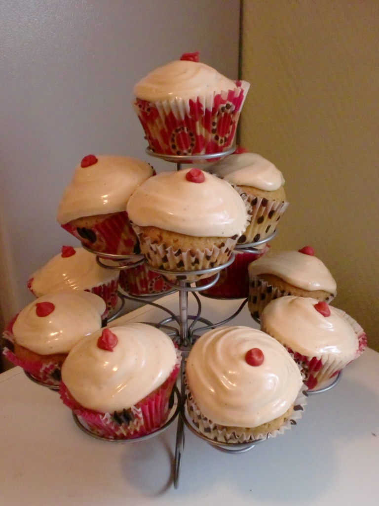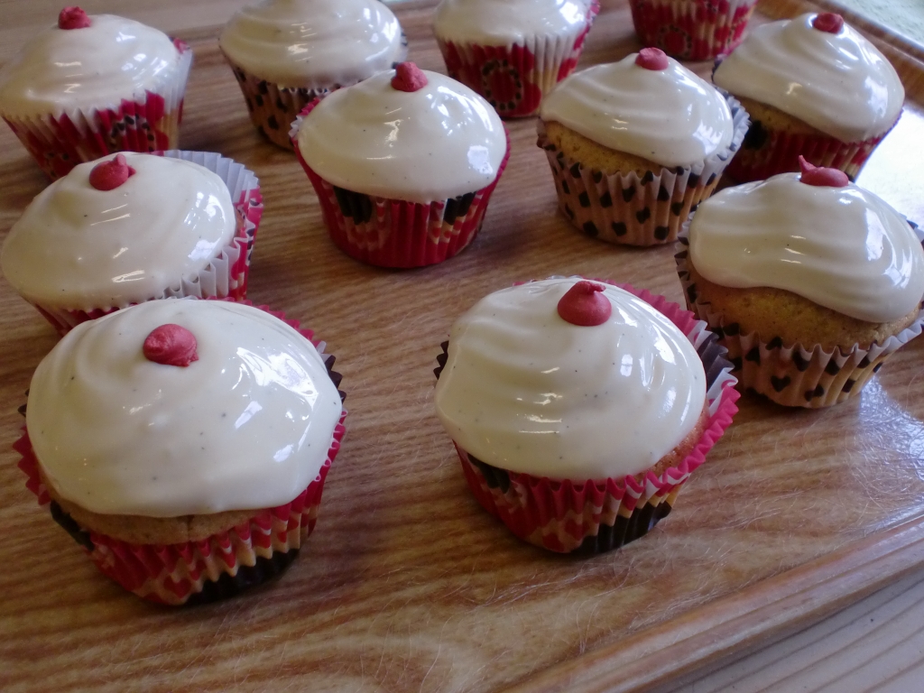 Bland alt til kremen med en mikser og stryk det på de avkjølte muffinsene. Ha evt på strøssel eller annen pynt. Kremen blir for løs til å kunne sprøytes, så den vil jeg eksperimentere litt mer med..