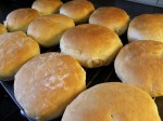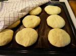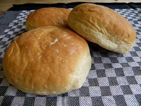 Ha deigen på benken og del i ca 22 emner. Trill ut store boller som trykkes flate. Legges på stekebrett og etterheves i 20 minutter.