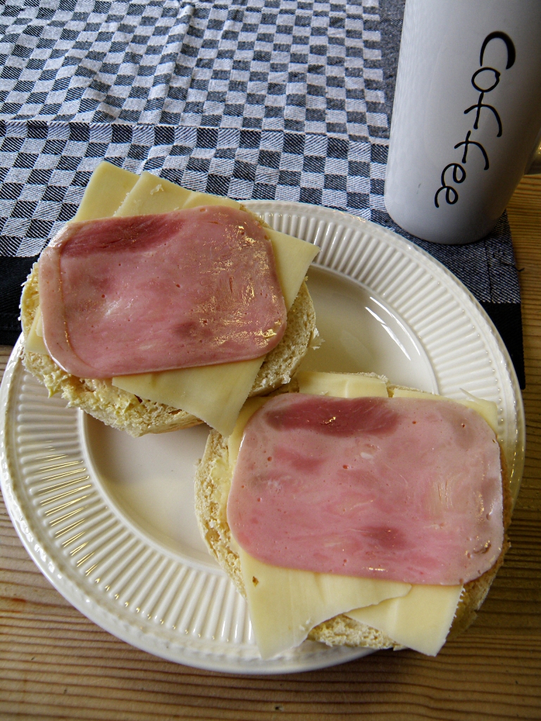 Servert med skinke fra den lokale slakterbutikken og gulost. Akkurat slik man kan få kjøpt dem hos Kalle’s, den lille bakeren på hjørnet…