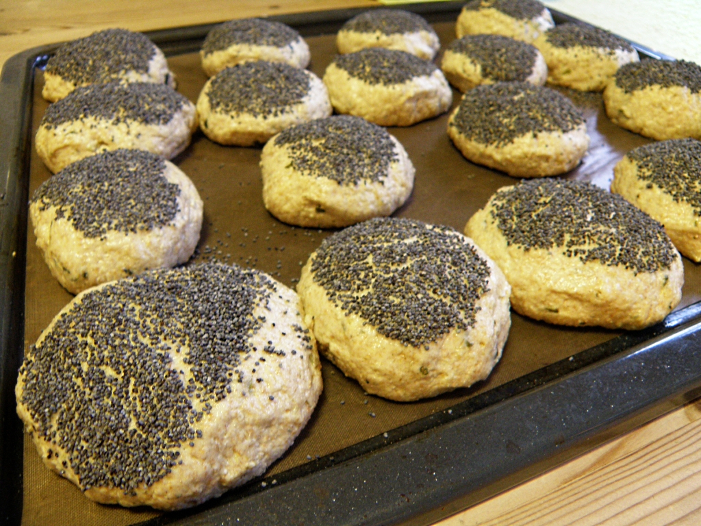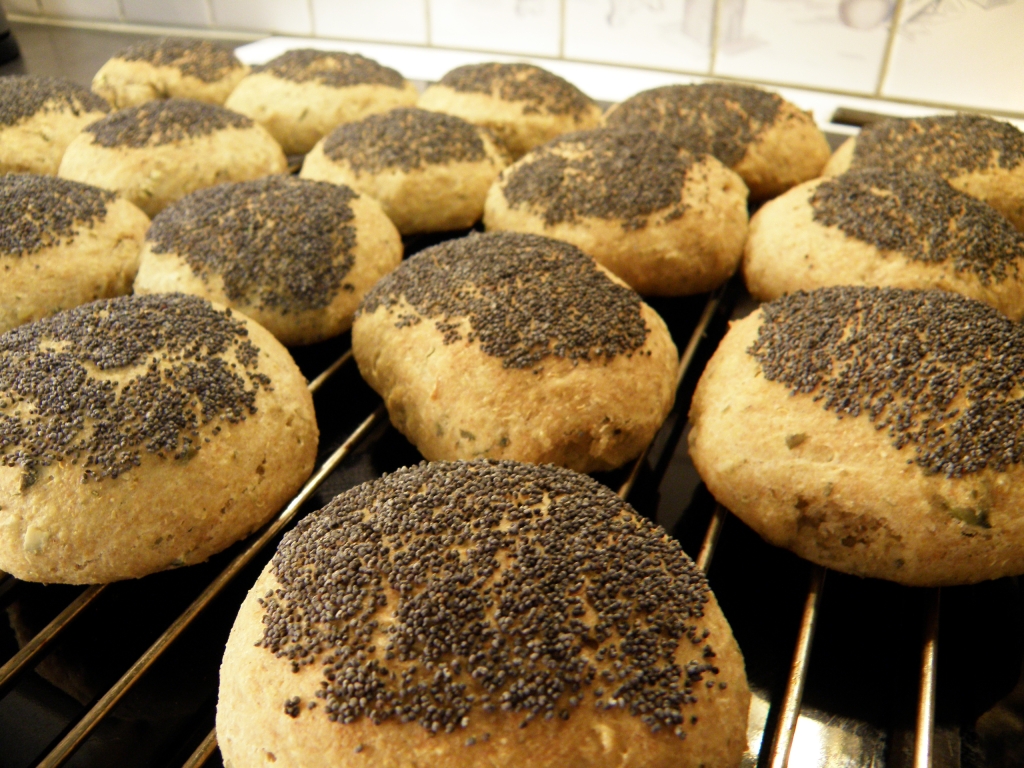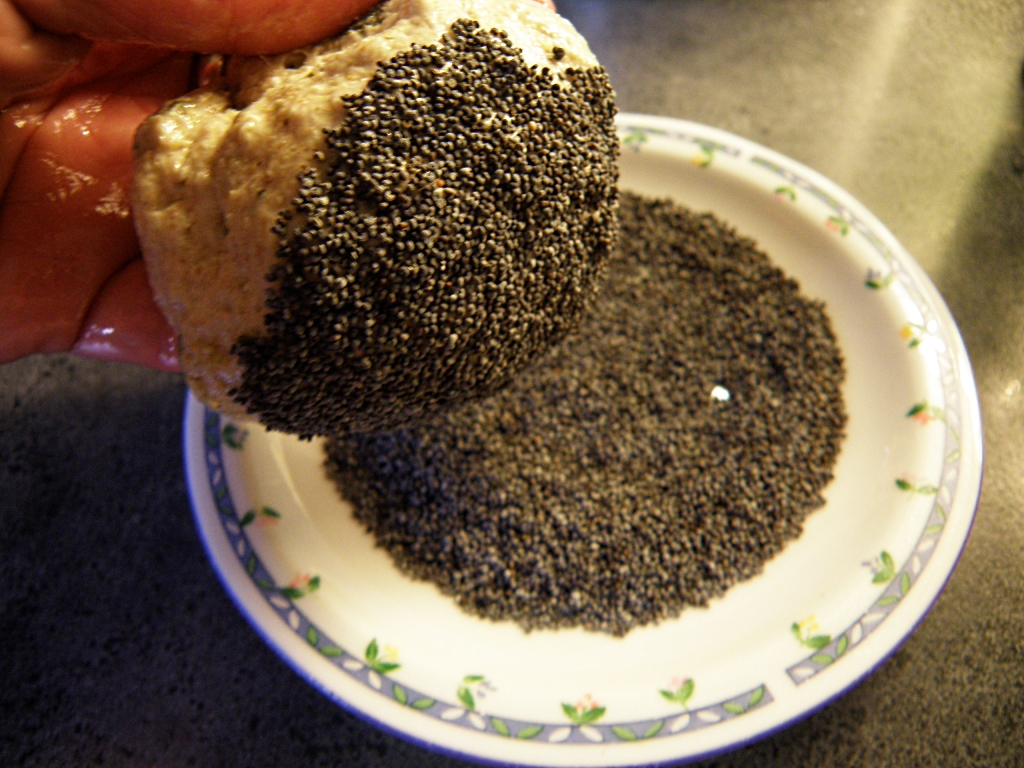 Hell litt olje på kjøkkenbenken og hvelv ut deigen på oljen. Strekk og brett den et par ganger. Del opp i stykker og form rundstykker som du dypper i valmuefrø.