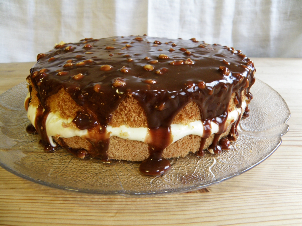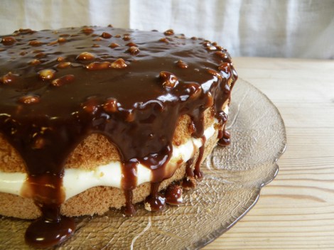 Kok opp fløte, smør og sjokolade og fordel det over kaken. Sett kaken kaldt til servering.