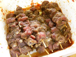 Tre kjøttbitene på spidd. Om du bruker trespidd, bør du bløtlegge dem en stund i forveien. Så er det bare å legge dem på varm grill og gjerne legge lokk over. Pensle evt med resten av marinaden underveis. Grilltiden er kort, 8-10 minutter så pass på at kjøttet ikke blir tørt.