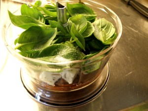 Pesto er noe jeg ikke har verken smakt eller laget tidligere, men min søster har alltid snakket varmt om denne dressingen/dip’en. Basilikum er noe jeg kan bruke til det meste, og jeg har en potte på terassen. Den ble nå utsatt for en kraftig rasering for mitt forsøk på en variant av pesto. Med impulsmatlaging og pinse, nytter det ikke å renne av gårde til butikken for manglende ingredienser, så da tar man hva man har.