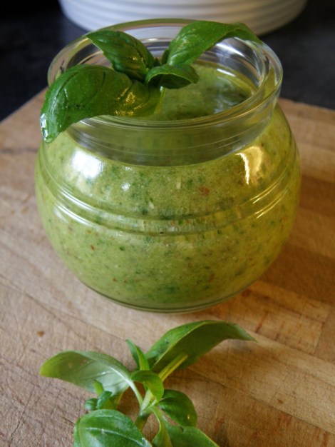 Servert som dressing til grillmat og ferske baguetter var dette riktig snadder. Egentlig var det nok med bare brød og pesto…