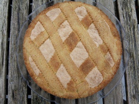 Pisk eggehvitene stive og ha i mandler og melis. Rør det lett sammen og fordel det over deigen. Kjevle ut resten av deigen og lag strimler som legges som gitter på kaken.